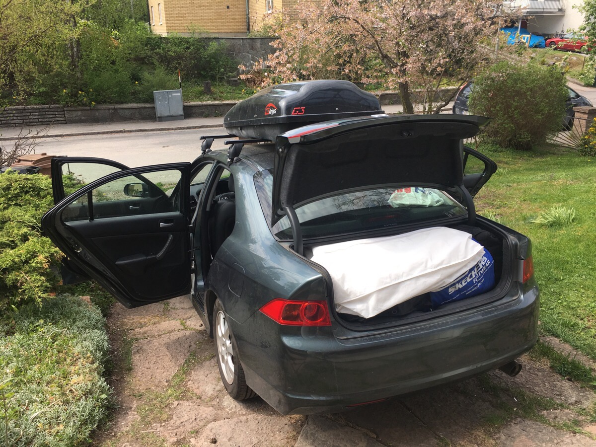 Det gick ju bra. Vi lämnade sommarvärmen och kom fram till 8 grader och regn. Fullastad bil. Triathlonresan till Zürich kanske slår i packning med alla prylar i olämplig storlek som skulle med då men denna gången var vi fem personer och en skrivare. Vi fick med allt, tror jag, och imorgon får Veronika validera hur skrynklig klänningen blev. Resan gick bra förutom ett kräkstopp i Brunflo. Givetvis såg vi älg på vägen också, ta det försiktigt alla ni som kör bil själva!