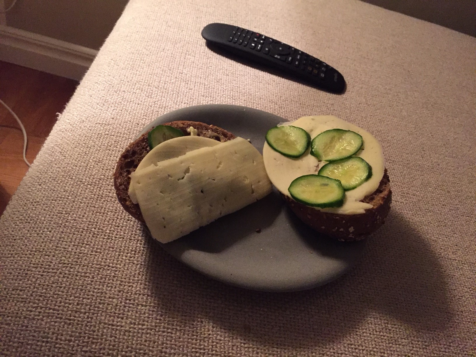 Jag tycker att gurkan ska vara överst, medan Johan hävdar att gurkan ska ligga under osten.