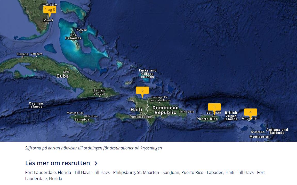 Det är inte helt lätt att välja kryssning, men till sist tänkte vi att det är lika bra att välja det allra nyaste och största fartyget – Harmony of the Seas. Vi ville också ha kryssningen i början av vår resa. Så det blir avresa från Fort Lauderdale 4 november med destination St Maarten, Puerto Rico och Haiti.