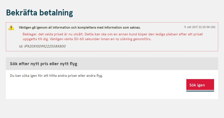 Trots att vi redan hade bestämt vilket flyg vi ska ta tog det rätt lång tid att boka. När vi hade skrivit in alla uppgifter får vi meddelandet: ”Det valda priset är slutsålt.” Då var det bara att börja om. Det nya priset var 30 kr högre per person så det spelar ju ingen större roll, men väldigt störigt att inget sparades utan att allt behövde fyllas i på nytt.