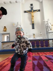 Några timmar efter (andra) anländandet till Alsen mitt i natten var det dags att träffa prästen. Vi lyckades få med hela familjen och var nog inte mer än 5 min sena. Calle mötte oss vid kyrkan och guidade oss sedan runt med instruktioner om hur kommande ceremoni skulle gå till. För oss är ju detta första gången men Calle har varit med förr så det känns tryggt. Vi tränade positioner och bekantade oss i lokalen. Lisa hade mkt spring i benen och gillade den stora salen och fick till stor glädje till slut med sig prästen att springa uppför altargången 🙂