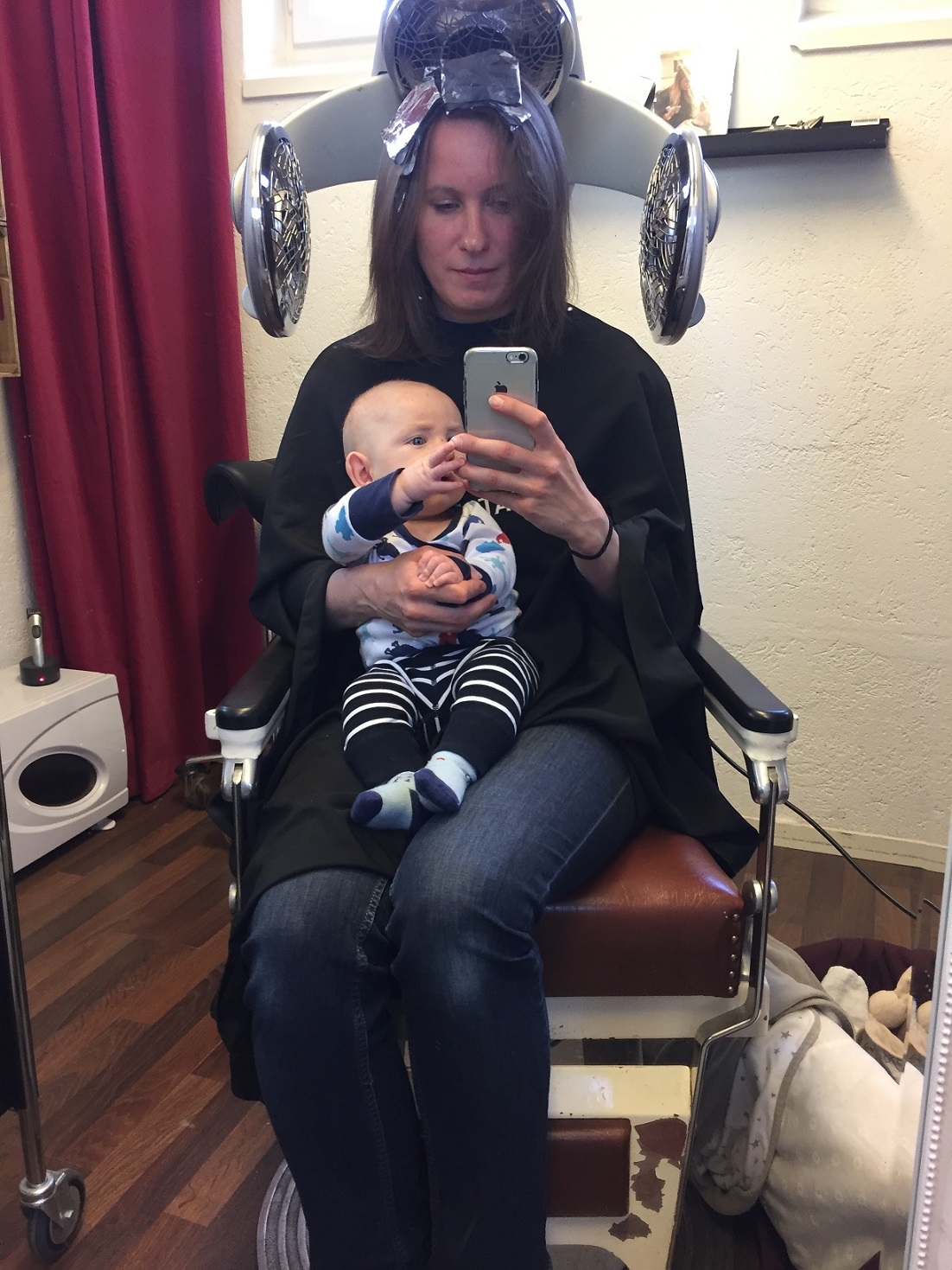 Inför bröllopet vill jag fräscha till mitt hår. Jag vill inte ändra hårfärg alltför mycket, men tänkte ge håret lite mer liv med slingor. Så idag var jag hos frisören. Oskar sov lugnt i sin vagn medan jag blev ompysslad. När allt var klart och håret tvättades ut syntes nästan ingenting. Så det blev nya slingor och då vaknade naturligtvis Oskar. Han fick sitta i mitt knä och då blev han nöjd. Tur att frisören ligger nära Lisas förskola. Jag hade tänkt att jag skulle hämta henne lite tidigare, men jag blev klar precis lagom till att hämta henne kl 16, vilket är precis så länge hon får vara där.